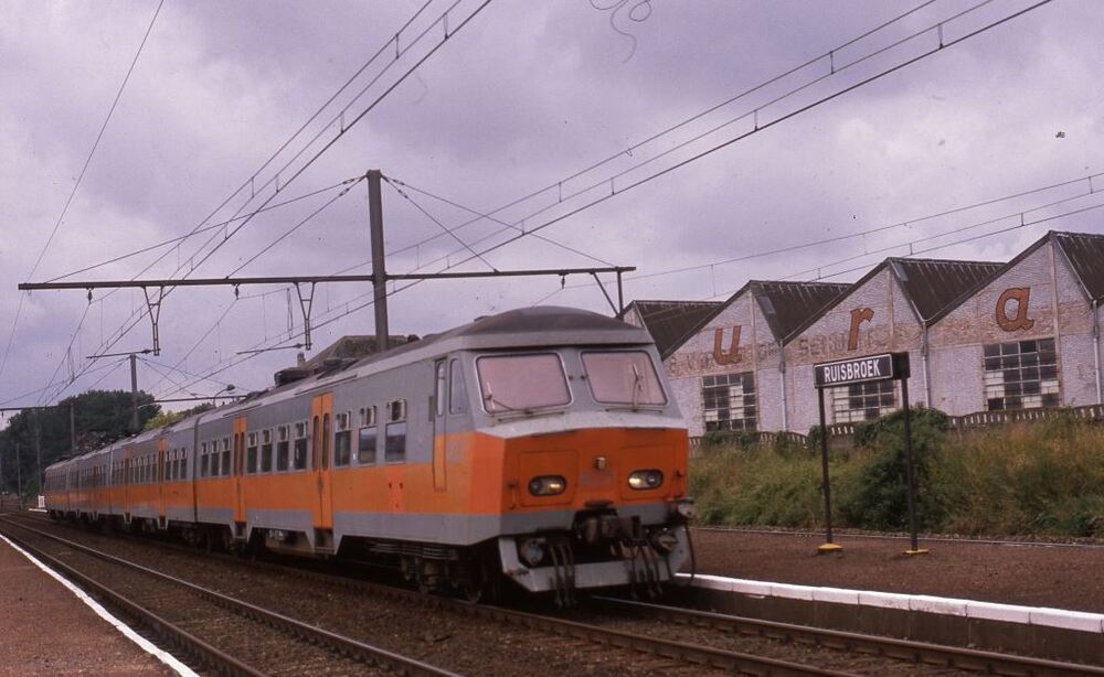 Vierledig motorstel 828 (reeks 08) staat aan het perron in station Ruisbroek. Op het perron staat een stationsnaambord. Het motorstel heeft nog zijn originele oranje-grijze livrei.