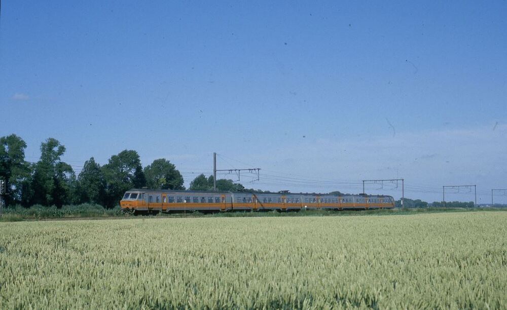 Deze fotogroep bevat twee dia's, genomen in de velden nabij Oudenburg. Op de eerste dia rijdt vierledig motorstel 830 (reeks 08) voorbij, op de tweede een reizigerstrein met de stellen 829 en 843.