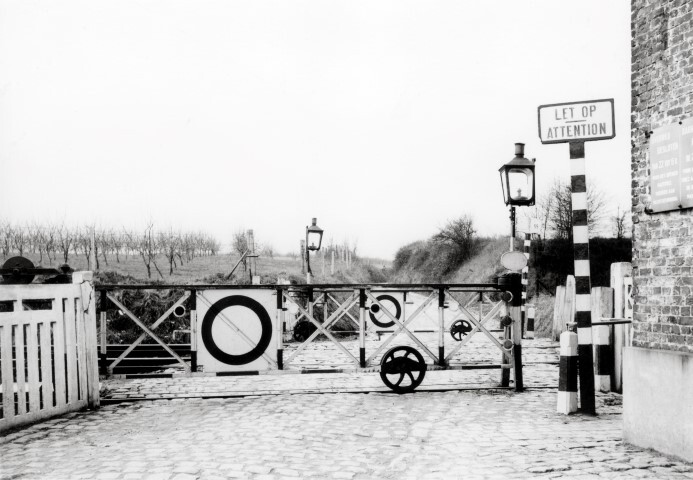 BeschrijvingDe foto toont een overweg met gesloten rolbareel. De verlichting bestaat uit twee petroleumlantaarns. Rechts staat een wit-rode paal met het opschrift 'Let op - Attention'.