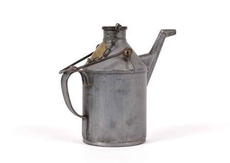 BeschrijvingDe kan heeft een smalle geknikte tuit, een vast handvat achteraan en een beweegbaar handvat bovenaan. De dop is vastgemaakt aan de kan door een ketting.