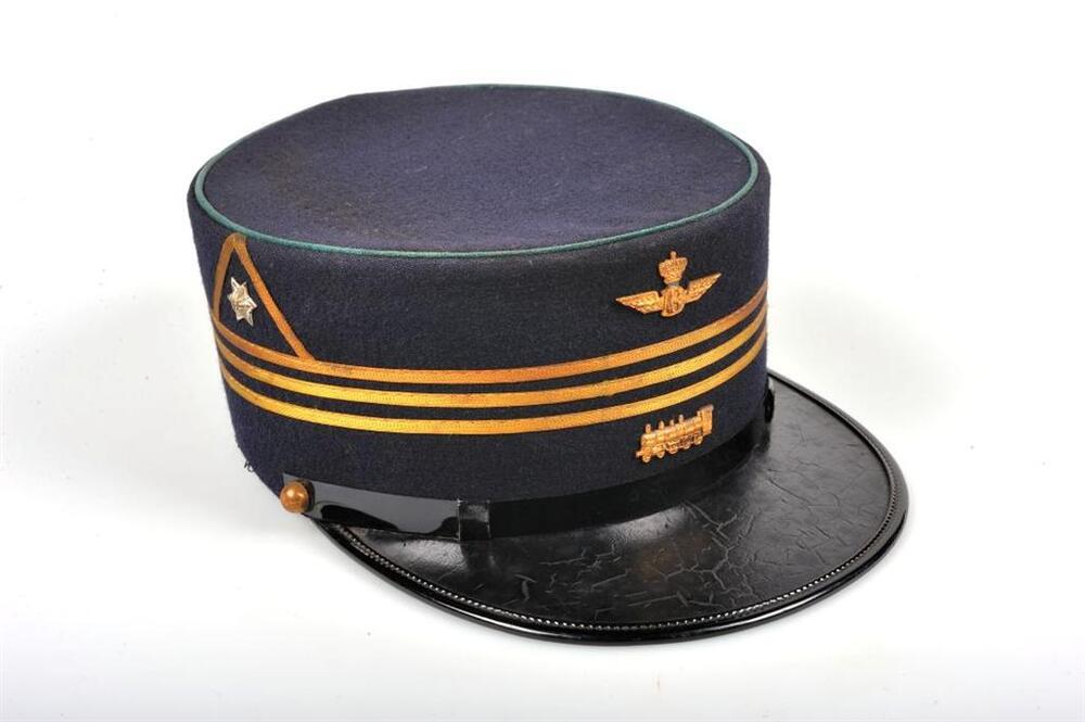 Zwarte kepie met zwarte klep in kunststof. De kunstoffen stormband is vastgemaakt met twee goudkleurige knopen. Er lopen drie gouden biezen, op ca 3 cm, 4 cm en 5 cm van de rand. Aan beide zijkanten loopt een gouden bies in driehoeksvorm met daarin een zilveren ster. De naadbies is groen. Vooraan is een spoorweginsigne bevestigd en daaronder een insigne in de vorm van een stoomlocomotief. De kepie is verstevigd met een leren band en de voering is beige of roodbruin.