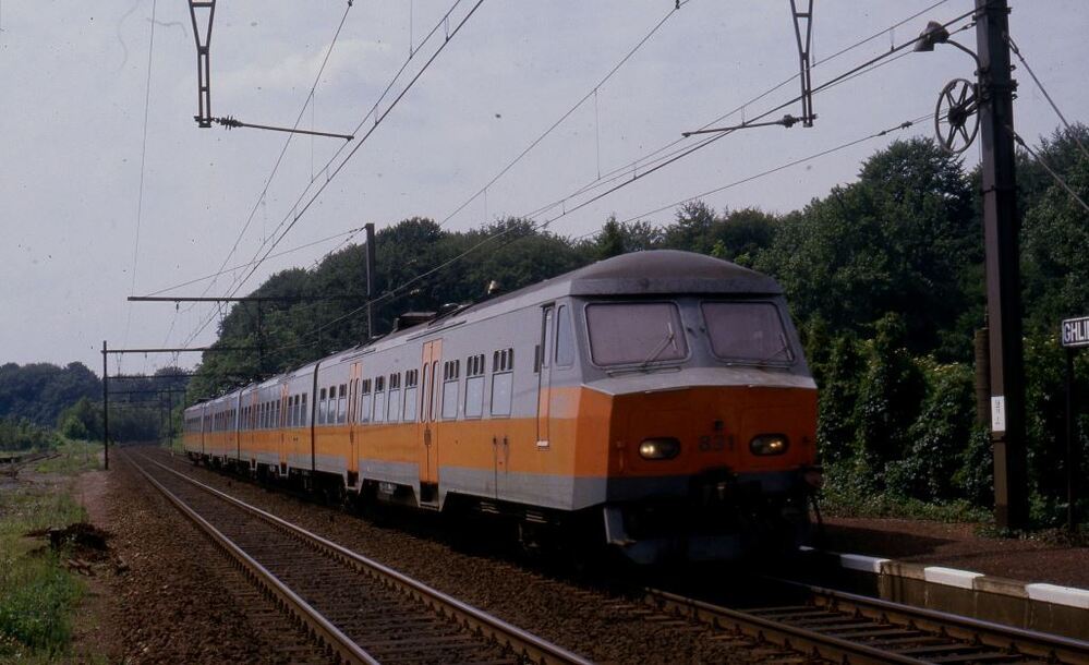 Vierledig motorstel 831 (reeks 08) staat aan het perron in station Ghlin. Rechts zien we nog net een gedeelte van het stationsnaambord. Het stel heeft nog zijn originele oranje-grijze livrei. Station Ghlin ligt langs spoorlijn 96 (Brussel-Zuid - Quévy - Franse grens). Schenking van Myriam Hendrickx.