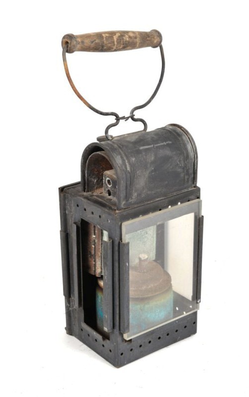 BeschrijvingVierkante draagbare lantaarn met drie glazen zijden en een houten handvat. Achteraan staat het NMBS-logo en bevindt zich een hendeltje om de lamp tijdelijk op te hangen. Binnenin de lamp zit een reservoir.
