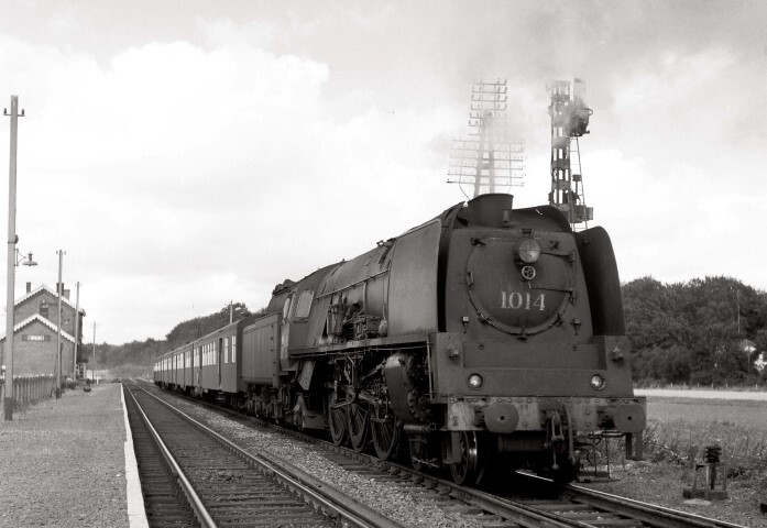 Stoomlocomotief 1.014 (type 1 - 2C1 Pacific) sleept een reizigerstrein bestaande uit drie M 2-rijtuigen door het station Ghlin. Rechtsonder naast het spoor zien we de stalen kabels waarmee de seingever vanop het seinhuis de wissels kon bedienen. Rechtsboven kunnen we nog net de achterkant van het mechanisch sein zien dat aan de trein doorrit verleende.