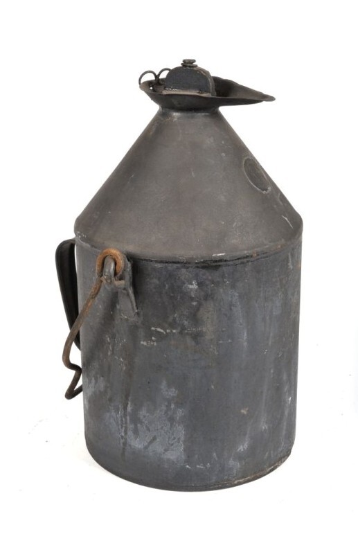 BeschrijvingDe kan heeft een kleine tuit met daarop een draaidopje met een stuk ketting. Aan de kan bevindt zich een groot beweegbaar handvat en achteraan een kleiner handvat. Vooraan vindt men een rond metalen plaatje terug waar '5L' en 'VR' is ingekrast.