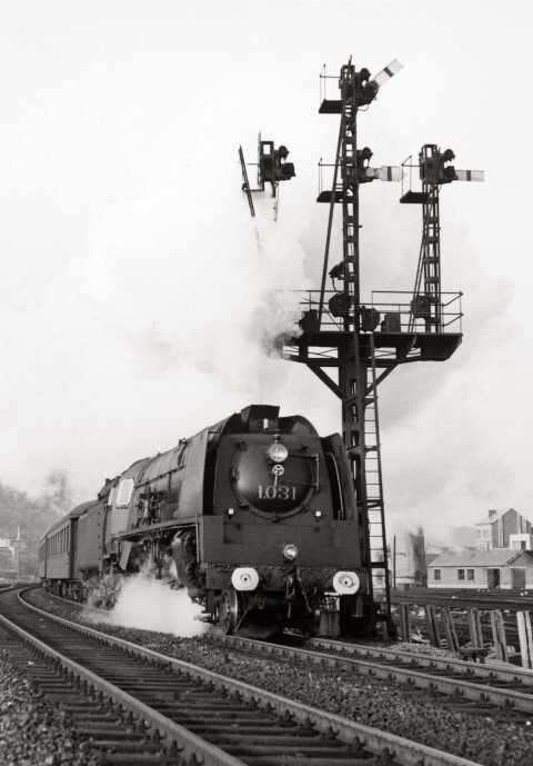 Stoomlocomotief 1.031 (type 1 -2C1 Pacific) sleept een reizigerstrein uit het station Luik-Guillemins. Rechts van de locomotief zien we de achterkant van drie mechanische seinen. Door de specifieke vorm van de mast waarop de seinen gemonteerd waren noemde men dergelijke mast een 'kandelaar'.