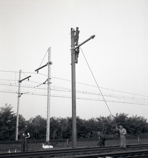 Deze fotogroep bestaat uit vijf negatieven. Ze tonen arbeiders die een 'arm' voor de draagkabel monteren op een bovenleidingspaal die typisch is voor de lijnen 27 (Schaarbeek - Antwerpen) en 124 (Brussel - Charleroi). Dit type van paal komt ook voor op lijn 26 tussen Schaarbeek en Linkebeek. Op de foto's B, C en E zien we bovenleidingspalen in vakwerk uit 1935.