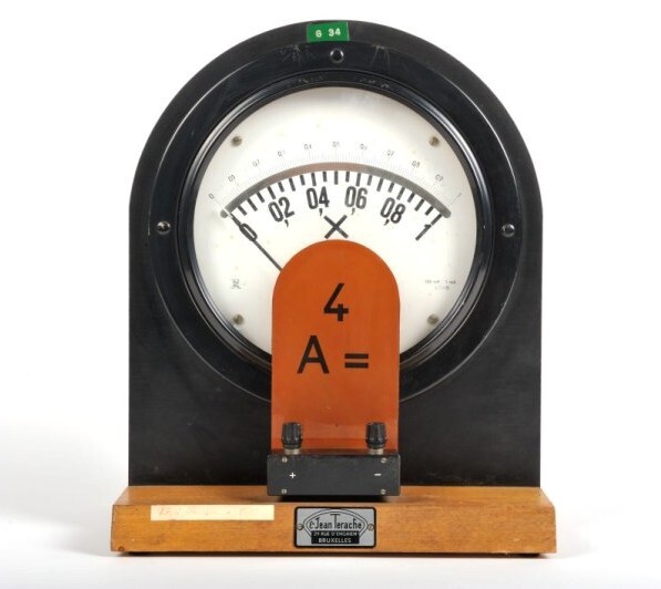 De ampère- en voltmeter zijn instrumenten om elektrische stroom te meten. Deze meter werd waarschijnlijk in een labo van de NMBS gebruikt. Het meetinstrument heeft een zwart frame en is op een houten plank gemonteerd. Achter een rond plastic scherm bevindt zich een witte plaat met een meetschaal van 0 tot 1. Vooraan bevinden zich twee stekkeringangen met de tekens '+' en '-'. Daar achter staat een bruin plaatje waarop '4 A=' staat. Aan de achterkant bevinden zich 10 stekkeringangen.