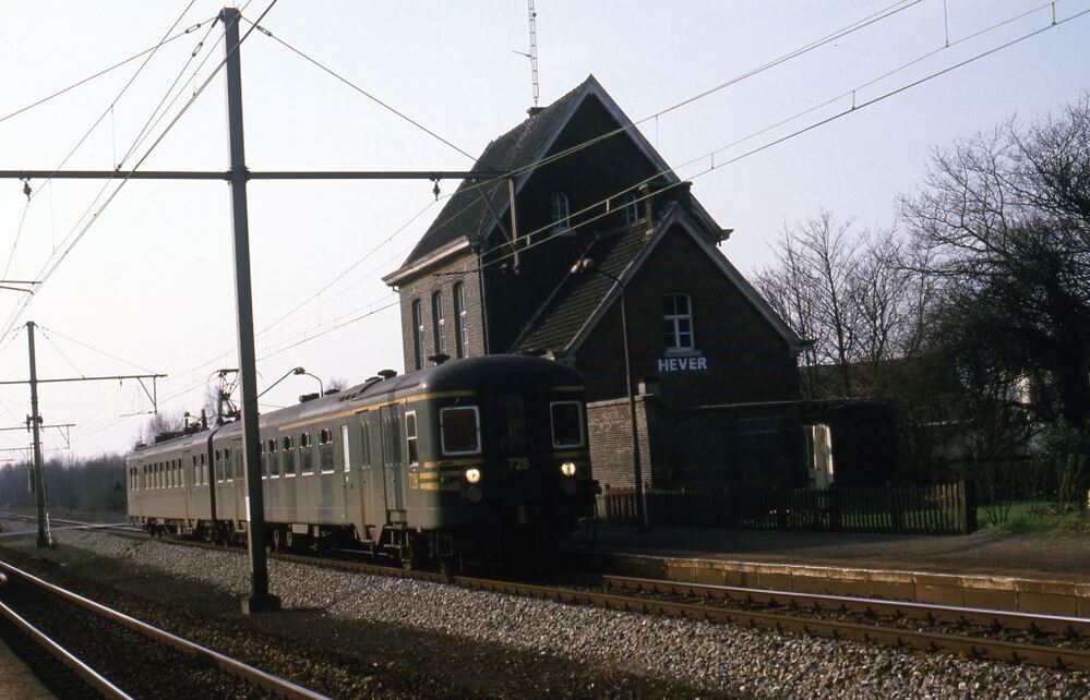 Motorstel 728 (reeks 06, schijf 1974) staat aan het perron in station Hever. We zien de achterzijde van het stationsgebouw met stationsnaam op de zijgevel. Dit station ligt langs spoorlijn 53 (Gent-Sint-Pieters - Mechelen - Leuven). Schenking van Myriam Hendrickx.