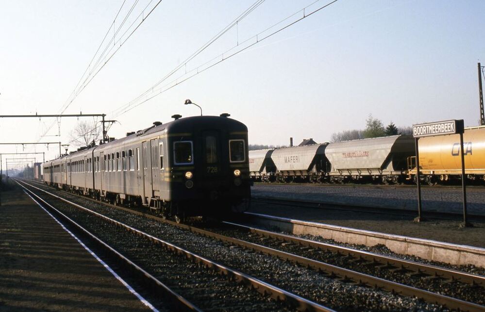 Een reizigerstrein met tweeledige motorstellen 728 (reeks 06, schijf 1974) en 761 (reeks 06, schijf 1979) staat aan het perron in station Boortmeerbeek. Op het perron staat een stationsnaambord. In de sporenbundel zien we enkele gesloten goederenwagens voor het vervoer van graan. Dit station ligt langs spoorlijn 53 (Gent-Sint-Pieters - Mechelen - Leuven). Schenking van Myriam Hendrickx.