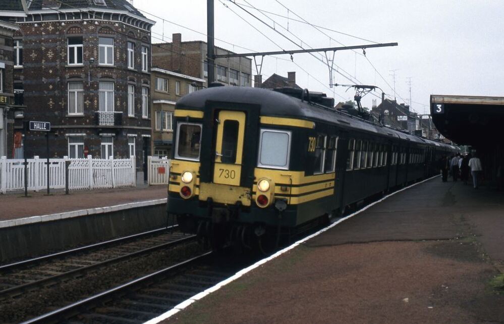 Een reizigerstrein met tweeledige motorstellen 730 en 680 staat aan perron 3 in station Halle. Dit perron is gedeeltelijk overdekt met een luifel. Op het andere perron staat een stationsnaambord. Motorstel 730 behoort tot reeks 06, schijf 1974. Station Halle ligt langs spoorlijn 96 (Brussel-Zuid - Quévy - Franse grens). Schenking van Myriam Hendrickx.