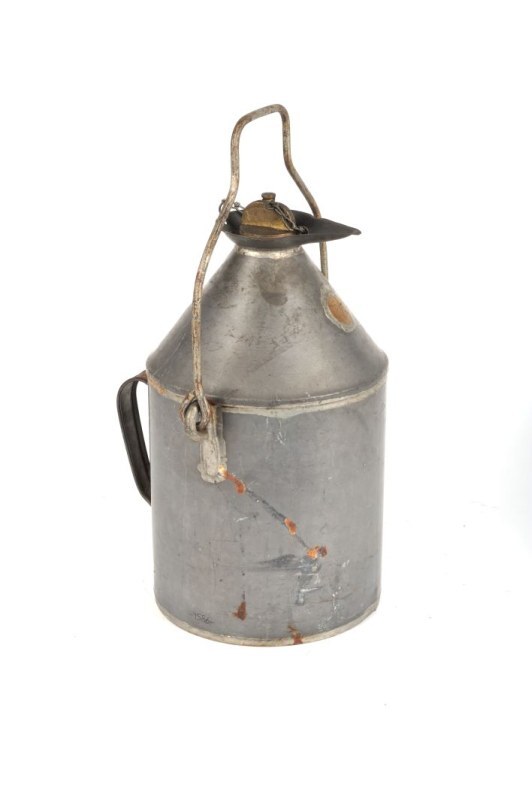 De kan heeft een kleine tuit met draaidop. De draaidop is door middel van een stuk ketting vastgemaakt aan de kan. Er bevindt zich vooraan een groot beweegbaar handvat en achteraan een kleiner handvat dat aan de kan is vastgemaakt. Vooraan vindt men een rond metalen plaatje terug waar '5L' en 'VR' is ingekrast.