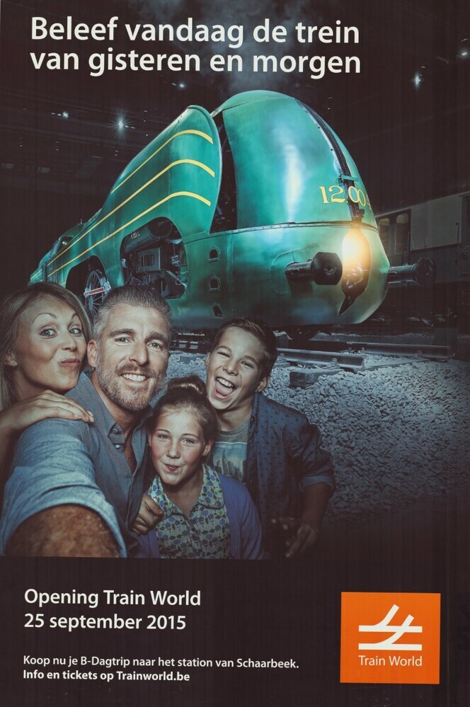 'Beleef vandaag de trein van gisteren en morgen Opening Train World 25 september 2015 Koop nu je B-Dagtrip naar het station van Schaarbeek. Info en tickets op Trainworld.be' (NMBS)