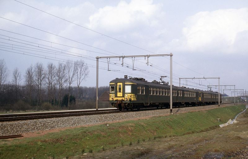 BeschrijvingEen reizigerstrein met tweeledige motorstellen 751 en 710 rijdt in de buurt van Aarschot. Motorstel 751 behoort tot reeks 06, schijf 1978.