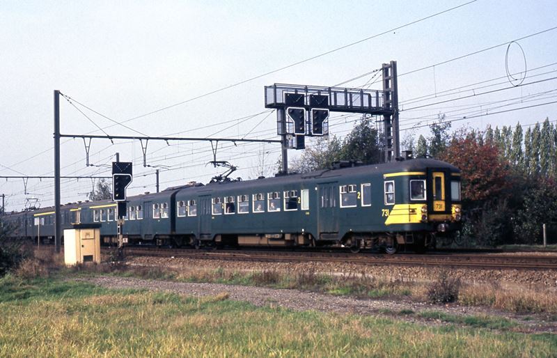 Een reizigerstrein met tweeledige motorstellen 731 (reeks 06, schijf 1978) en 503 (reeks 00, schijf 1955) rijdt in de buurt van Lier onder een seinportaal met twee lichtseinen.