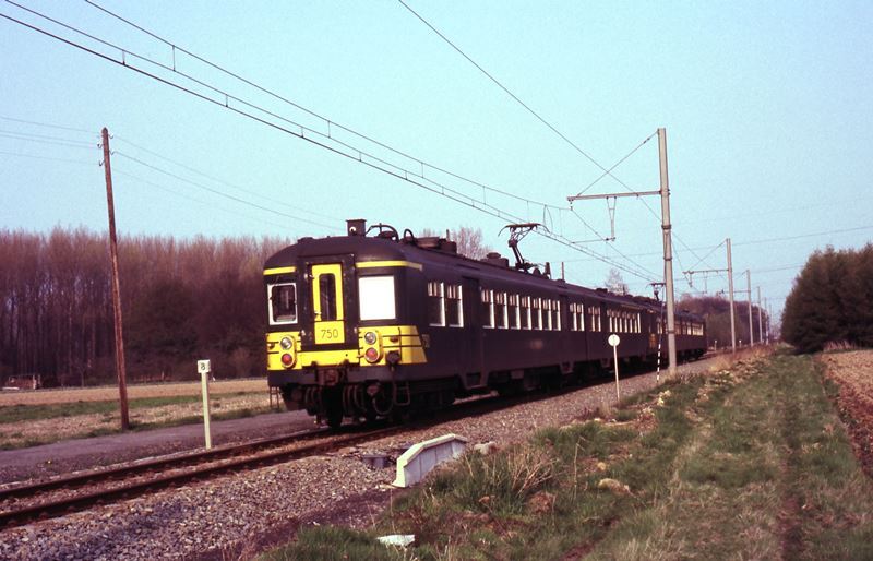 Een reizigerstrein met tweeledige motorstellen 750 en 779 rijdt in de buurt van Lier. Naast het spoor staat een hectometerpaal met de vermelding '8'. Motorstel 750 behoort tot reeks 06, schijf 1978 en stel 779 tot schijf 1979. Schenking van Myriam Hendrickx.