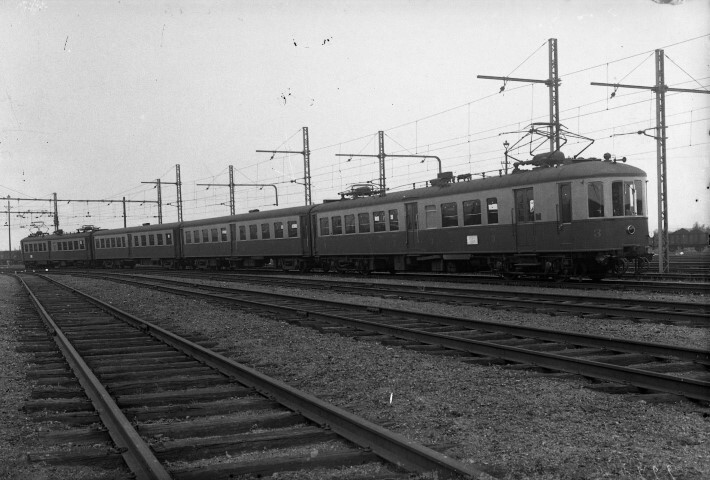 We zien een motorstel 1935 met gelichte stroomafnemers opgesteld in een bundel en wachtend op de volgende inzet. Het rijtuig op kop van het motorstel is een derdeklasrijtuig. Bovenop het dak, in het midden van de stuurcabine, zien we de duidelijk de hoorn waarmee de bestuurder claxoneerde. Op de zijkant van het motorstel zijn op het eerste en op het laatste rijtuigen ritborden aangebracht. Op deze witte afneembare metalen platen stonden het begin- en het eindstation van de uit te voeren rit.