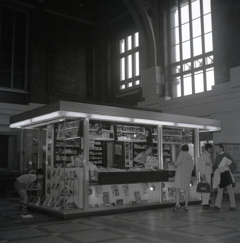BeschrijvingDeze fotogroep bestaat uit twee negatieven. Ze tonen een kranten- en tijdschriftenkiosk in de wachtzaal van het station. Enkele reizigers blijven staan aan de kiosk.