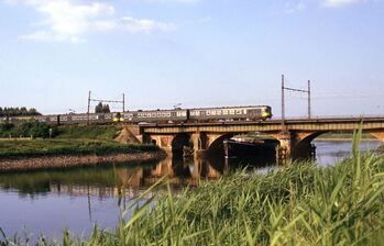BeschrijvingEen lange reizigerstrein met tweeledige motorstellen 735, 724, 774, 777 en 773 rijdt over de rivier de Nete in Duffel.