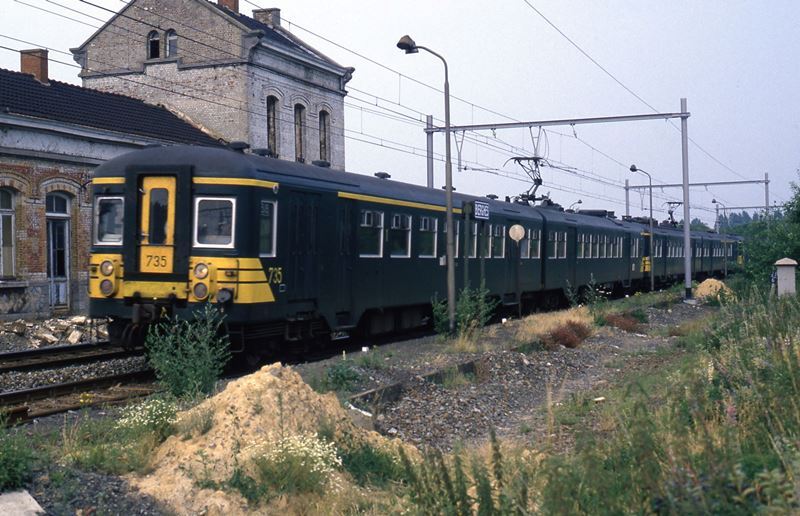 Een reizigerstrein met tweeledig motorstel 735, gekoppeld aan een ander tweeledig stel, rijdt voorbij het oude stationsgebouw van Bierk (Bierghes) dat buiten gebruik is. Motorstel 735 behoort tot reeks 06, schijf 1978. Station Bierk ligt langs spoorlijn 94 (Halle - Doornik - Franse grens). Schenking van Myriam Hendrickx.