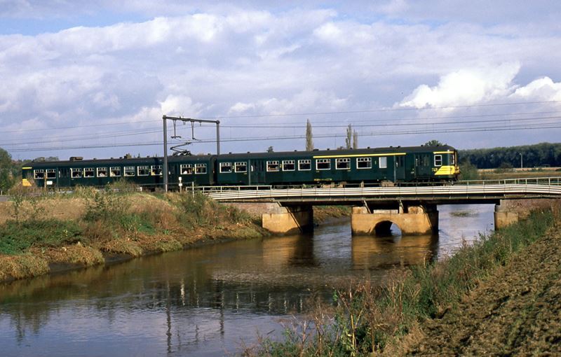 Motorstel 749 (reeks 06, schijf 1978) rijdt over de rivier de Nete in Lier, richting Aarschot. Het motorstel is groen geschilderd met gele zichtbaarheidsstrepen.