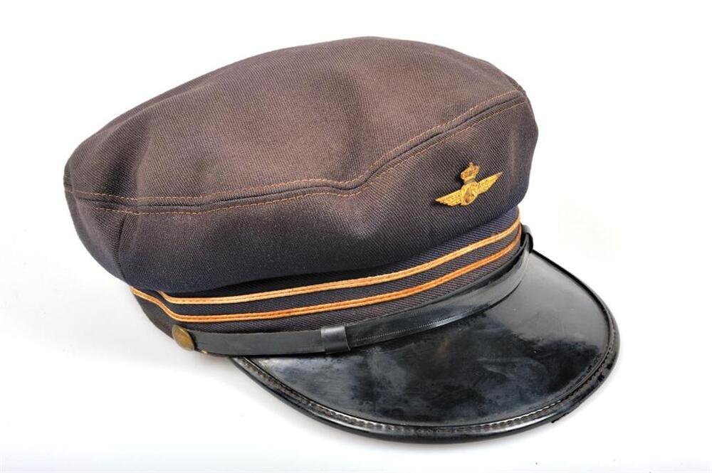 Grijsblauwe dienstpet met zwarte klep in kunststof. De stormband is in kunststof en is vastgemaakt met twee metalen knopen. Er lopen twee gouden biezen, op 1,5 en 2,5 cm boven de rand. Vooraan is een spoorweginsigne bevestigd. De platte pet is verstevigd met een leren band en de voering is bruin.