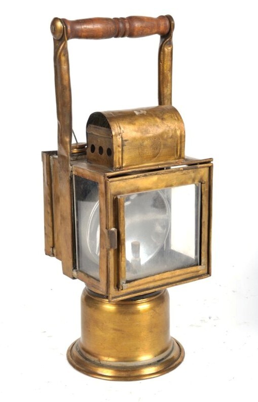 Deze vierkante carbidlantaarn heeft drie glazen zijden. De voorste zijde kon vervangen worden door een glasplaatje in een kleur naar keuze. De glasplaatjes werden bewaard in een houder aan de achterkant. De lantaarn is geplaatst op een voet die diende als reservoir. Achteraan staat het NMBS-logo.