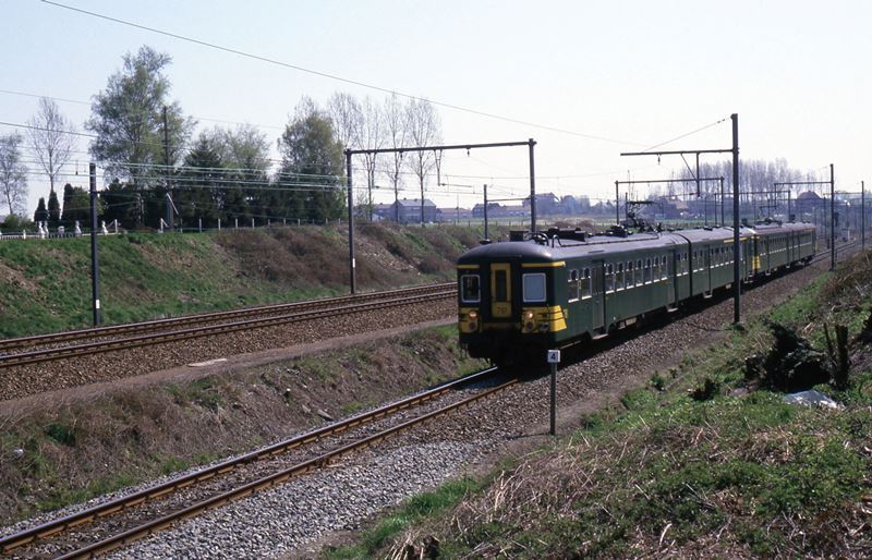 Een reizigerstrein met tweeledige motorstellen 781 en 214 rijdt in de buurt van Teralfene. Motorstel 781 behoort tot reeks 06, schijf 1979 en stel 214 tot reeks 00, schijf 1963. Naast de sporen staat een hectometerpaal met de vermelding '4'. Schenking van Myriam Hendrickx.