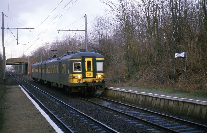 Tweeledig motorstel 759 (reeks 06, schijf 1979) komt aan in de stopplaats Boondaal. Op het perron staat een stationsnaambord. Deze stopplaats ligt aan spoorlijn 26 (Schaarbeek/Machelen - Halle).