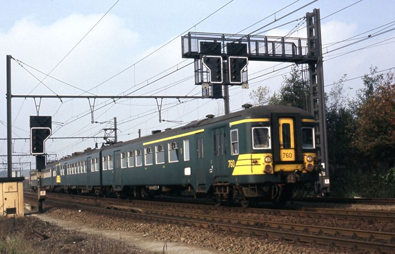 Een reizigerstrein met tweeledige motorstellen 760 en 241 rijdt onder een seinbrug in Lier. Motorstel 760 behoort tot reeks 06, schijf 1979 en stel 241 tot reeks 00, schijf 1963.