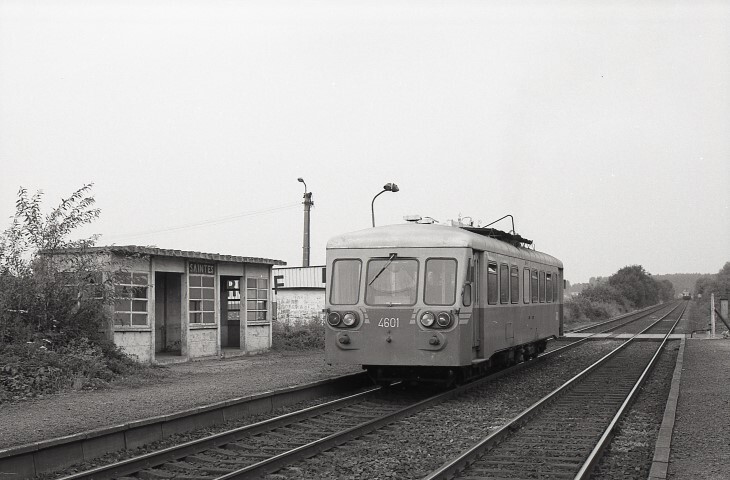 Deze motorwagen behoort tot de reeks 46. Links zien we een betonnen schuilhuisje met de stationsnaam op geschilderd. Net achter de motorwagen zien we een overweg en op het rechtse spoor komt een diesellocomotief aangereden. Deze stopplaats ligt langs lijn 94 (Halle - Doornik - Blandain - Franse grens). Schenking van Myriam Hendrickx.