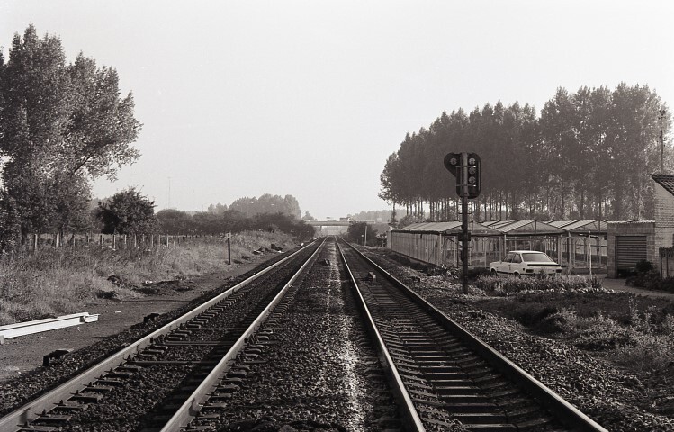 We zien spoorlijn 34 (Luik - Tongeren - Hasselt) in de richting van Bilzen. Rechts zien we de achterzijde van een lichtsein. Tussen de rails van het rechtse spoor zien we een 'krokodil'.