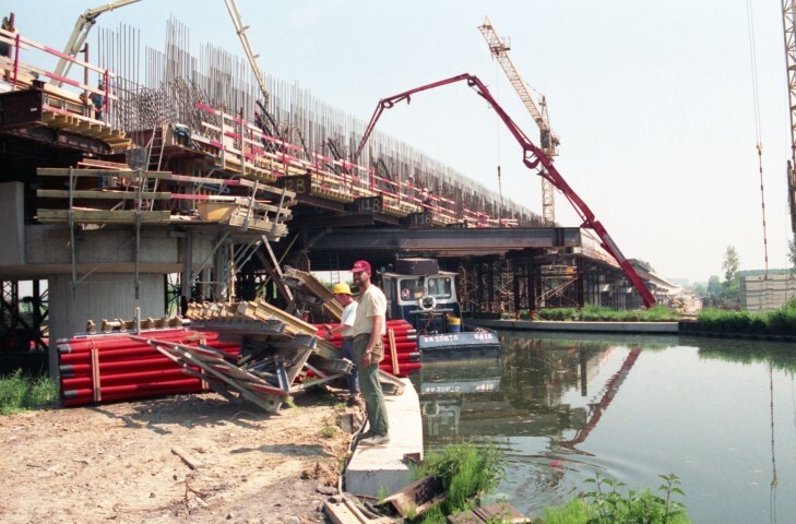 Deze fotogroep bestaat uit vijf negatieven. Ze tonen arbeiders bij het gieten en gladstrijken van het beton tussen de U-vormige ijzers die het brugdek vormen. Het viaduct overbrugt het kanaal Blaton - Aat en heeft een lengte van 2005 meter.