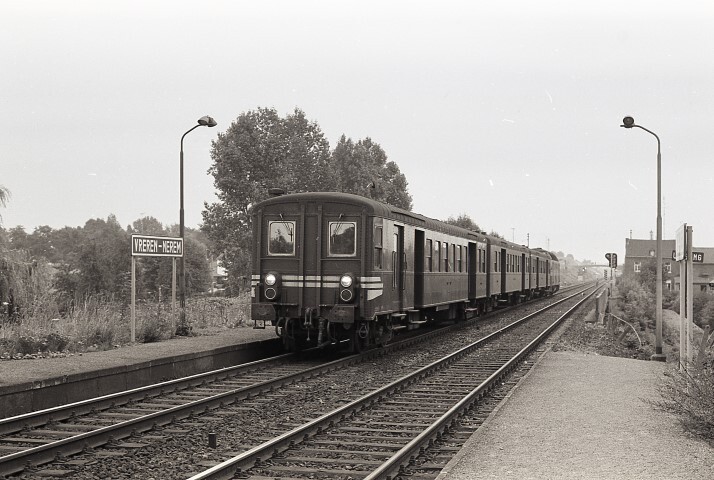 Deze foto toont een M 1-rijtuig met stuurpost en bagageruimte. Treinen die uitgerust waren met een rijtuig met stuurpost werden ingezet om aan het eindpunt van de rit rangeringen met de locomotief te vermijden. Op het linkse perron zien we het stationsnaambord. Schenking van Myriam Hendrickx.