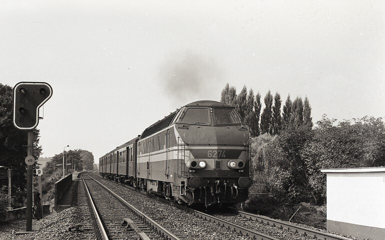 Deze locomotief behoort tot de reeks 62. Ze heeft M 2-rijtuigen aan de haak. Links zien we een waarschuwingssein, te herkennen aan het klein rond bord gemonteerd op de seinmast. Tussen de rails van het linkse spoor bemerken we een 'krokodil'. Schenking van Myriam Hendrickx.