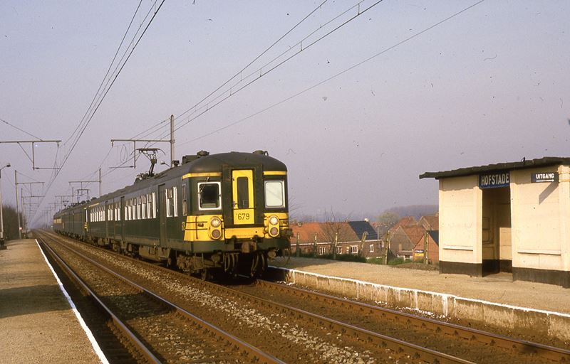 Een reizigerstrein met tweeledige motorstellen 679, 079 en 651 komt aan in de stopplaats Hofstade. Op het perron staat een oud wachthuisje. Motorstel 679 behoort tot reeks 06, schijf 1973. Stopplaats Hofstade ligt langs spoorlijn 57 (Dendermonde - Lokeren). Schenking van Myriam Hendrickx.