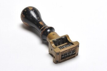 TitelMetalen stempel met houten handvat 'Erquelinnes N°7' en een verrolbare datum