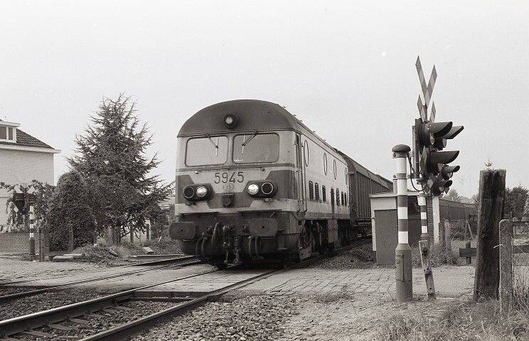 Diesellocomotief 5945 aan een overweg in Hoeselt