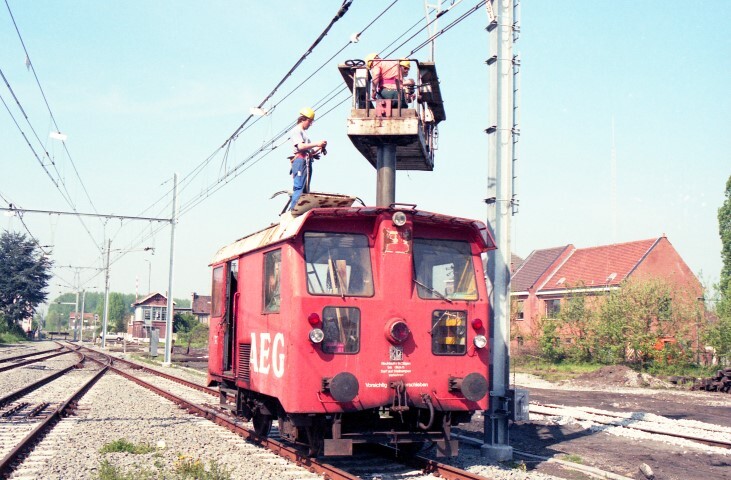 Deze fotogroep bestaat uit 15 negatieven. Ze tonen de werkzaamheden aan de bovenleiding die uitsluitend voor lage snelheden geschikt is. De draisine is met een werkplatform en pantograaf uitgerust. Ze is rood geschilderd. Op de zijkant staan de initialen van de onderaannemer 'AEG' (Allgemeine Elektricitäts-Gesellschaft). De arbeiders leggen de laatste hand aan de ophanging van de rijdraden.