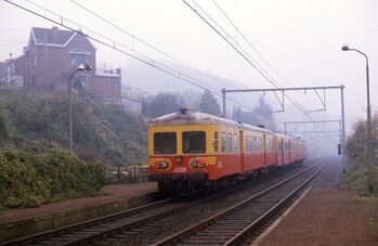 BeschrijvingEen reizigerstrein, samengesteld uit motorwagens 4336 en 4310 met tussenin een R-aanhangrijtuig, rijdt voorbij het voormalige station Ensival.