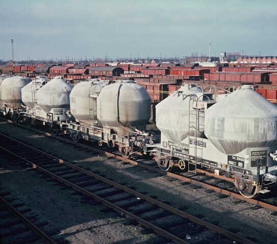 De foto toont silowagens op twee assen met de lettercode Ucs. Deze wagens worden gebruikt voor het vervoer van cement. Ze hebben een verschillende bovenbouw. Op de achtergrond zien we open en gesloten goederenwagens van diverse types in een grote sporenbundel.