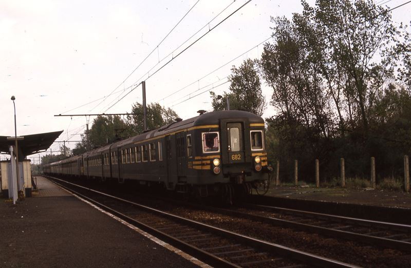 Een reizigerstrein met tweeledige motorstellen 682, 755, 205 en 527 staat aan het perron in station Liedekerke. Links zien we een kleine luifel boven een gedeelte van het perron. Motorstel 682 behoort tot reeks 06, schijf 1973. Station Liedekerke ligt langs spoorlijn 50 (Brussel-Noord - Gent-Sint-Pieters). Schenking van Myriam Hendrickx.
