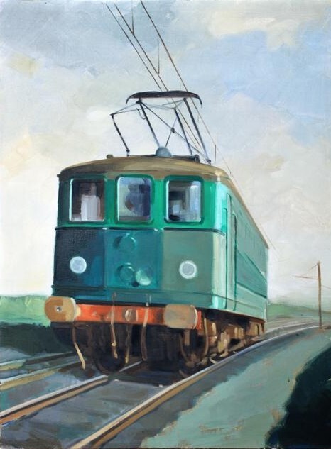 BeschrijvingEen groene elektrische locomotief rijdt op het spoor.