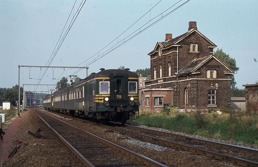 Een reizigerstrein met tweeledige motorstellen 713 en 696 rijdt op spoorlijn 35 (Leuven - Hasselt). Rechts zien we het oude stationsgebouw van Rotselaar, dat buiten gebruik is. Motorstel 713 behoort tot reeks 06, schijf 1974. Schenking van Myriam Hendrickx.