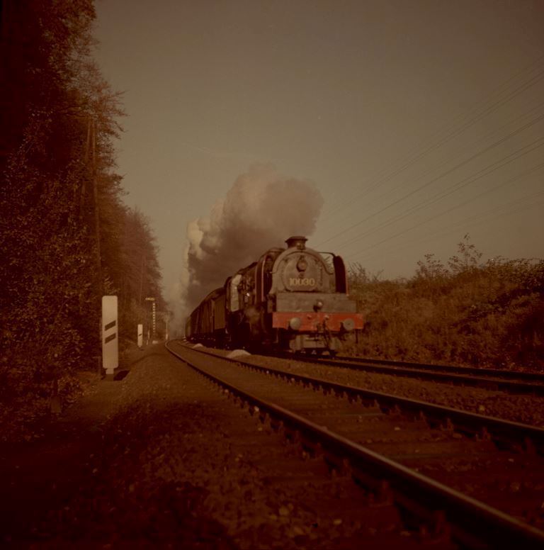 BeschrijvingLocomotief 10.030 (2C1 Pacific) passeert het Zoniënwoud onder volle stoom met een sleep rijtuigen. Naast de spoorlijn staan telefoonpalen en bakens die een waarschuwingssein voorafgaan.