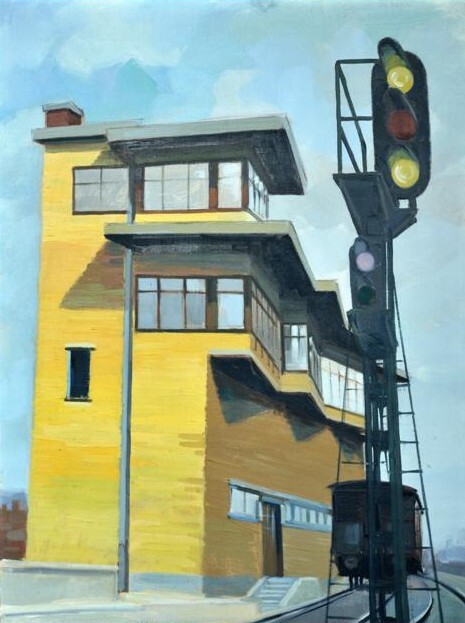 BeschrijvingSchilderij van een seinhuis met daarnaast een seinpaal met lichtseinen.