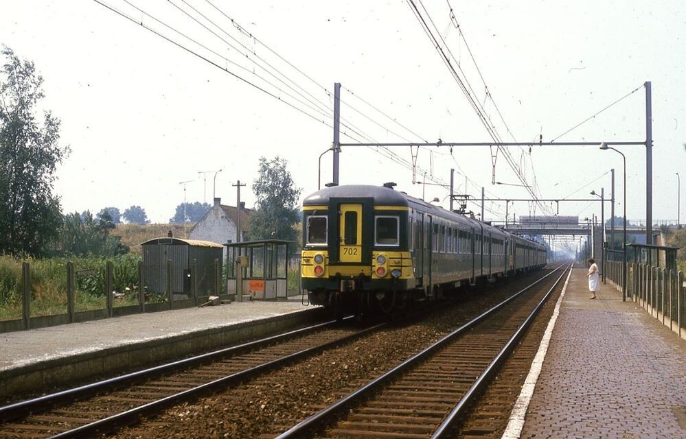 We zien de achterzijde van een reizigerstrein met motorstel 702 en andere tweeledige stellen. De trein staat aan het perron in station Bellem. Op het perron staan verlichting en een wachthuisje. Motorstel 702 behoort tot reeks 06, schijf 1973. Station Bellem ligt langs spoorlijn 50A (Brussel - Oostende). Schenking van Myriam Hendrickx.