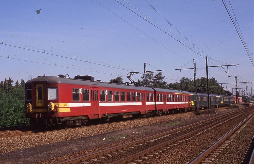 Een lange reizigerstrein met tweeledige motorstellen 712, 752, 159 en 972 rijdt voorbij station Eppegem. Deze trein met achteraan een poststel werd ingezet ter gelegenheid van de Gordel van Brussel. Motorstel 712 behoort tot reeks 06, schijf 1974. Op de achtergrond zien we de perrons van station Eppegem. Schenking van Myriam Hendrickx.