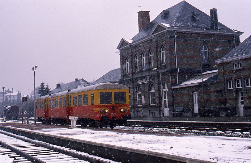 Deze fotogroep bevat vier dia's. Motorwagen 4501 staat aan een besneeuwd perron. Rechts zien we het stationsgebouw. Op de achtergrond staan ook enkele goederenwagens.