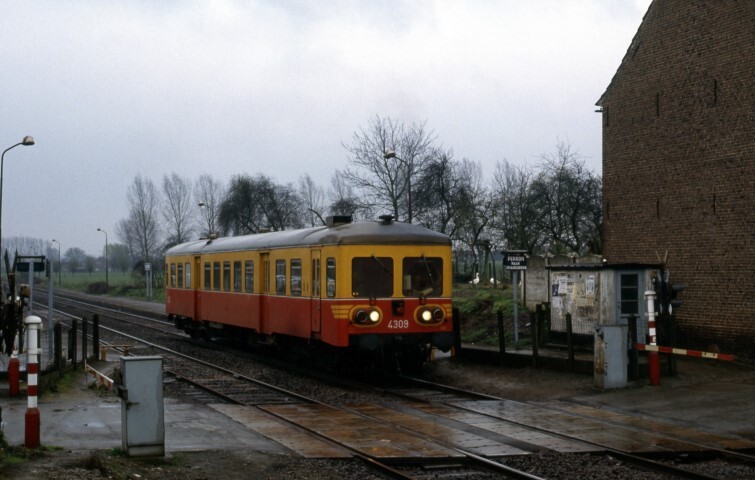 Deze fotogroep bevat drie dia's. Motorwagen 4309 staat aan het perron. We zien enkele dienstborden, schuilhuisjes en de perronverlichting. Op de eerste foto is ook een overweg te zien met een bareelwachterswoning. De laatste foto toont de motorwagen bij het verlaten van de stopplaats. Schenking van Myriam Hendrickx.